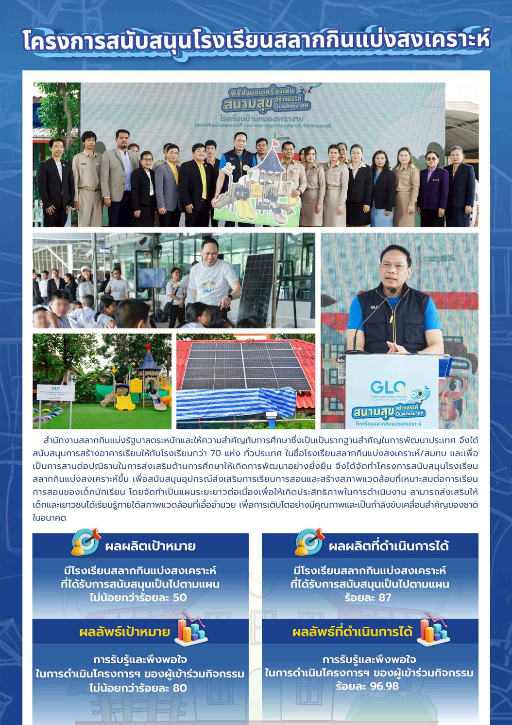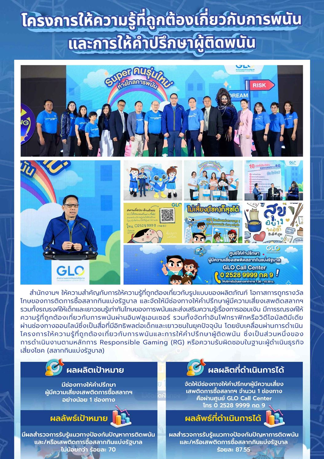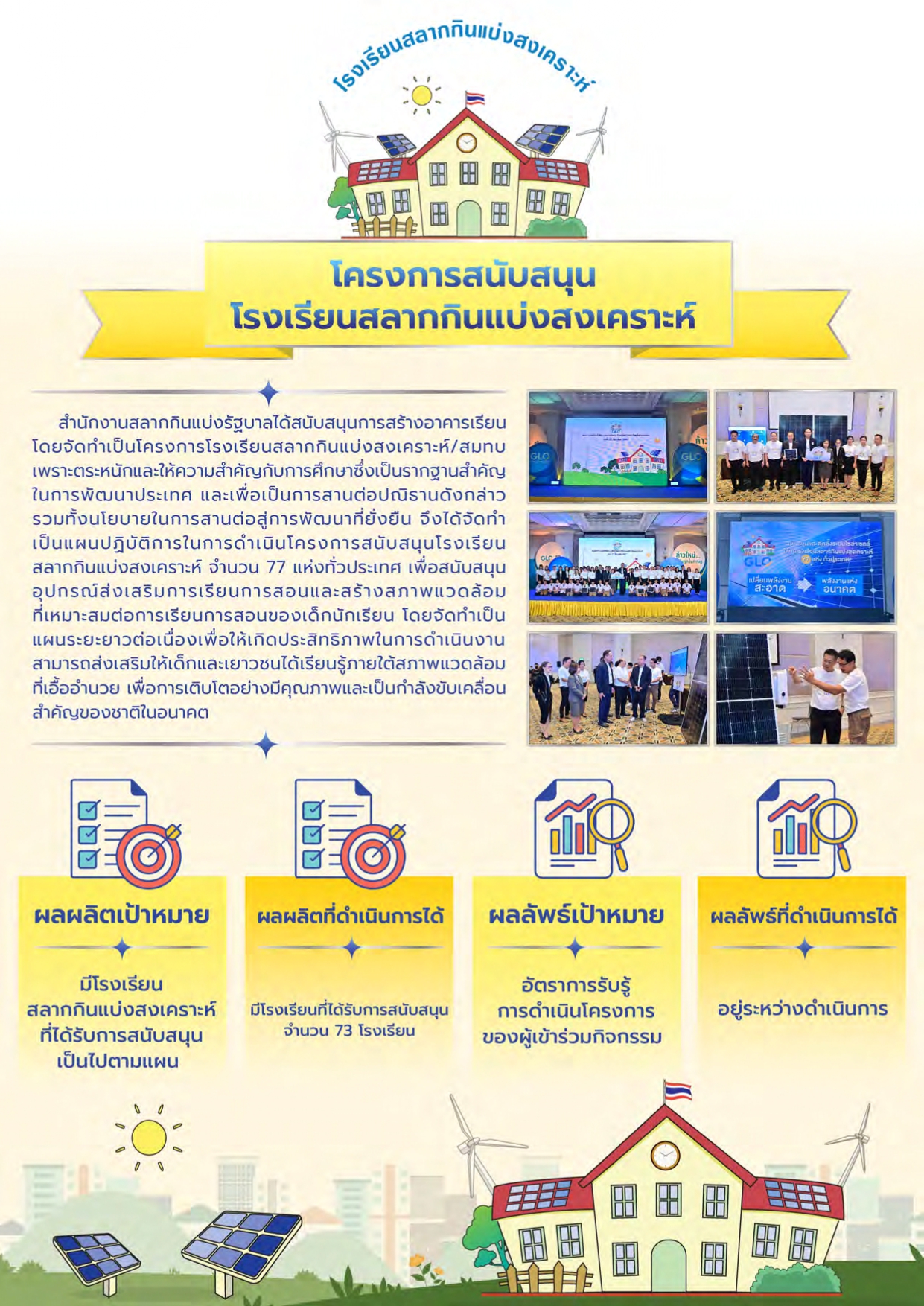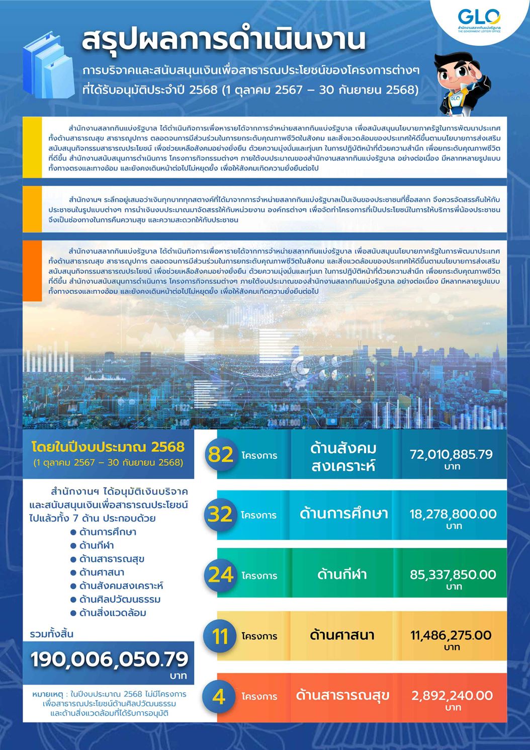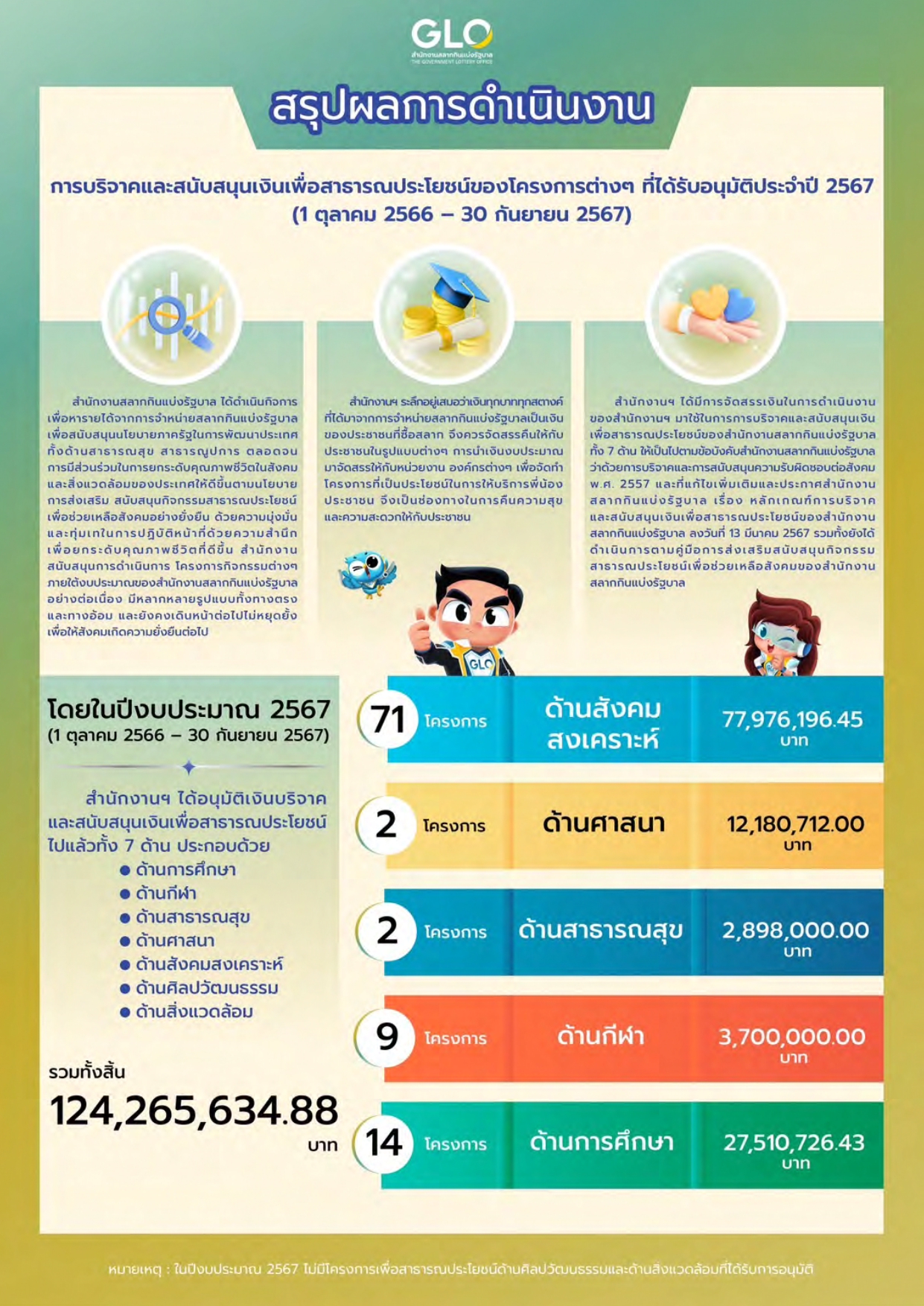 นางสาวแพรทองธาร ชินวัตร นายกรัฐมนตรี ได้แถลงนโยบายของรัฐบาลต่อรัฐสภา เมื่อวันที่ 12 กันยายน พ.ศ. 2567 โดยมุ่งเน้นการพัฒนาประเทศในด้านต่าง ๆ ให้สอดคล้องกับสภาพสังคมที่เปลี่ยนแปลงไป สร้างความร่วมมือกับทุกภาคส่วน เปลี่ยนความท้าทายเป็นโอกาสในการพัฒนา ภายใต้นโยบายเป็นรัฐบาลแห่ง “ความหวัง โอกาส และความเสมอภาคทางเศรษฐกิจและสังคม” พร้อมเพิ่มศักยภาพ สร้างโอกาส และสร้างความเสมอภาคทางเศรษฐกิจและสังคมให้กับประชาชนทุกคน เพื่อพลิกฟื้นประเทศจากปัญหาที่รุมเร้าและ ทำให้ประเทศไทยเดินไปข้างหน้าอย่างมั่นคง และเพิ่มความสามารถในการแข่งขัน วางรากฐานสู่การพัฒนาประเทศในอนาคต รวมถึงเร่งผลักดันให้เกิดการพัฒนาคนไทยทุกช่วงวัย สำนักงานสลากกินแบ่งรัฐบาล เป็นส่วนหนึ่งในการผลักดันการดำเนินงานให้เป็นไปเป้าหมายที่กำหนดไว้ตามนโยบายของรัฐบาล โดยมีโครงการที่เกี่ยวข้องกับการดำเนินงานของสำนักงานฯ ตามนโยบายดังต่อไปนี้